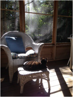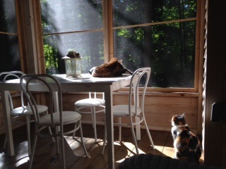 It is a new moment to savor and enjoy. Gurney has found a sunny spot on the table to bathe. The breeze has picked up a bit and the glass chime hung above the table now makes a tinkling sound. McAllister has joined us and found a sunny spot to bask in it on the floor.