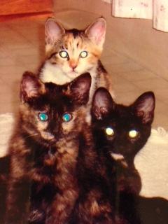 2018 Update: In July of 2017 we had to say goodbye to our dear little “Dunkin punkin”. She was born with one misshapen kidney and the other was smaller than normal. The vet told us early on that cats with kidney problems don’t live long lives. I had forgotten that but had obviously filed it away recalling that statement shortly after her death. We did the best we could providing her with special food and medicine to help her live her life. In a week’s time early in July she declined dramatically from what had appeared on the outside to be a fully functioning cat. It was a very sad time and I still miss that little one. There truly is only one “Dunkin punkin” as I told her zillions of times. Life isn’t the same here for sure with out her. We are adapting and the other two have filled in some of the empty spaces she’s left. I am very grateful we were able to have her in our lives for the 12 1/2 years she was with us! Dunkin is the black kitten in the picture above.