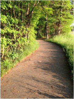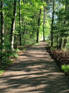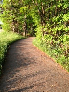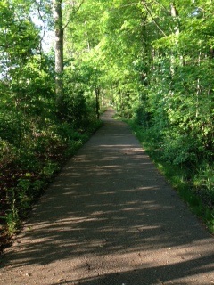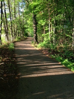 Around that corner is a delightful path through some woods with curves and slight bends and you really don’t know what lies up a head in spots. The sun streams in brightly through the trees in the morning along that part of my path. It is quite beautiful. It is my slice of heaven. I can pretend I’m far away and not see the road that really is just 10 feet away.