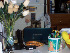 Samantha otherwise known as Missy, Sammy, Sam, Missy ‘Wissy’ is the princess of the house. She likes to cuddle, talks a lot actually most all the time in a cute squeaky little voice, is very sweet, petite and is an acrobatic cat who fearlessly climbs onto the porch rafters. She is a mother hen who likes to give us all baths including my husband and I. She will come over to me and bug me for food by licking my hair…tis a good thing she is so cute! In this house us girls gotta stick together too as we are outnumbered!